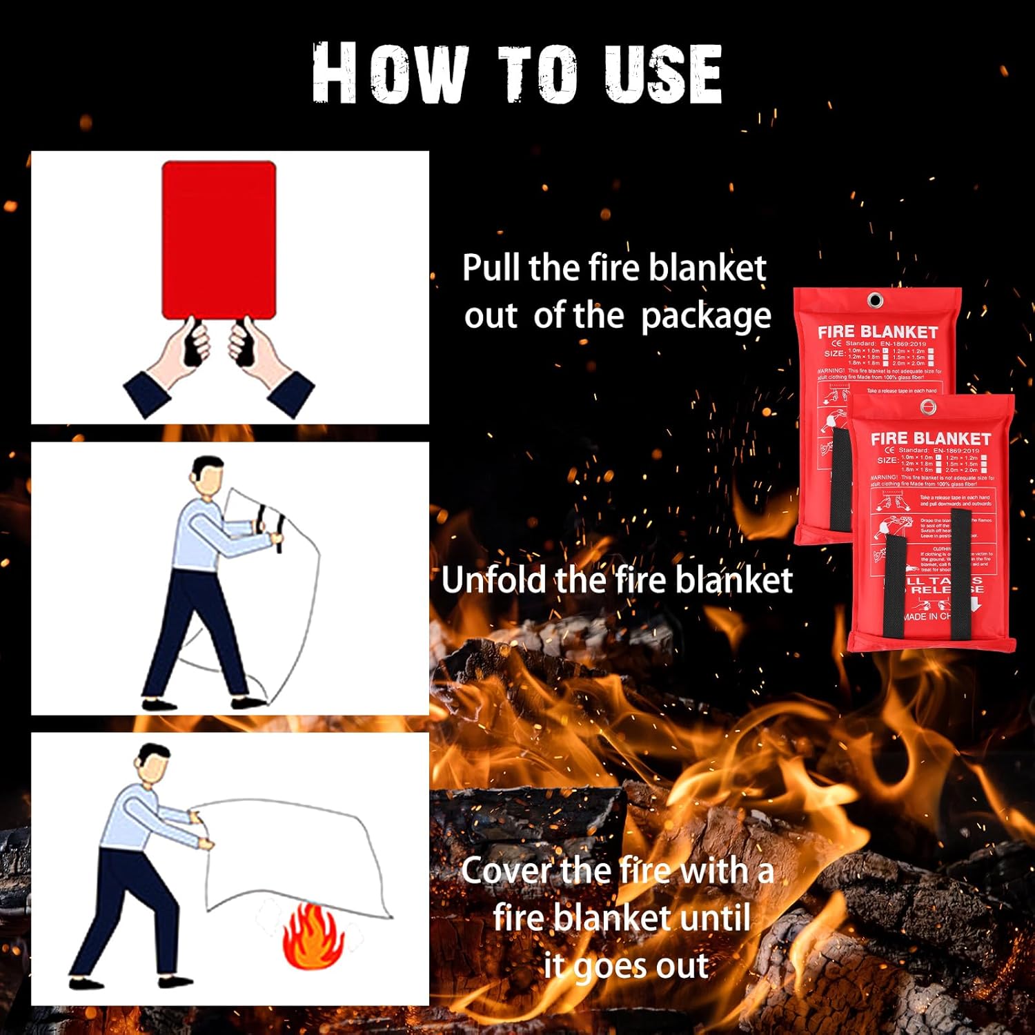 Designed for simplicity: in an emergency, pull the tabs, spread the blanket over the flames, and let it sit to suffocate the fire. It creates no chemical mess or residue, unlike some fire extinguishers.